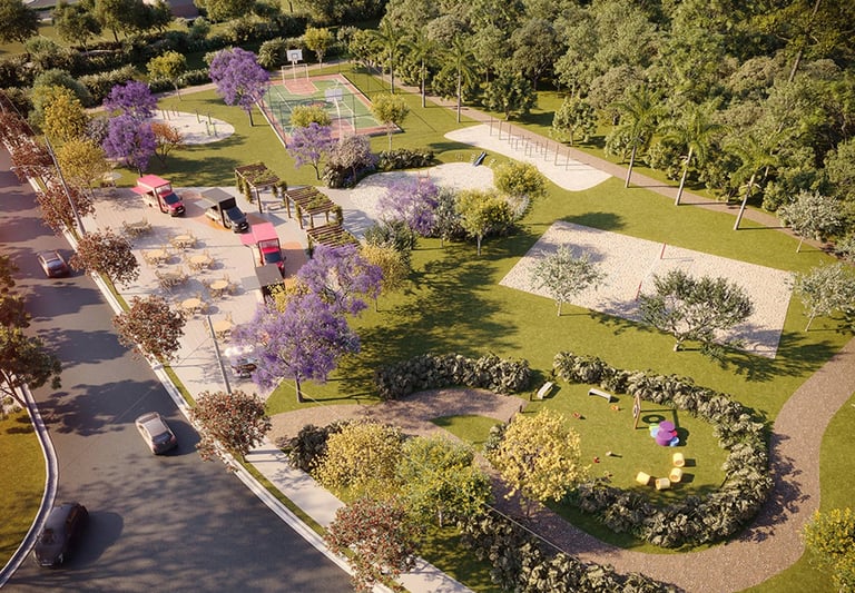 Conta com infraestrutura completa — asfalto, água, esgoto, iluminação pública — e lazer com playground, campo gramado, pista de caminhada e área de food truck.